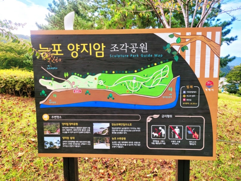 2016년 국토생태탐방로인 누태마을전망대까지 이어지는 15.5㎞ 양지암등대길을 걷다 보면 거제의 아름다운 풍경을 즐길 수 있는 양지암조각공원을 만날 수 있다. 공모를 통해 선정된 전국 유명 조각가 작품 21점을 시작으로 현재 총 40여 점이 기다리고 있다.
