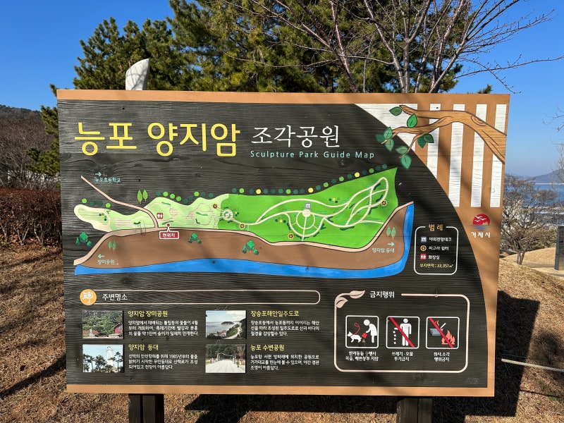 거제도 중심부에서 우측 동쪽 해안부에 위치한 능포항은 어업 자원이 풍부한 항구로 특산품인 보리새우가 유명하다. 바닷가에 위치한 무지개 돌담길도 인상적이다. 바닷바람을 느끼며 걷기 좋고 또 방문하고 싶은 거제 능포 수변공원이다. 3. 양지암조각공원 거제시 능포로 194