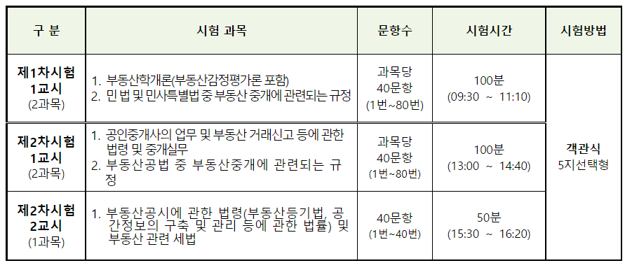 다만 취득이 쉽지 않습니다. 충분한 시간과 노력을 들여 반복 학습과 문제 해결에 도움이 되고 있어야 합니다. 응시자 수는 계속 증가하고 있지만 합격자 수와 합격률 조절을 위해 매년 난이도가 높아지고 있어 이에 대비해야 합니다. 공인중개사 시험과목은 1차 민법 및 민사특별법+부동산학개론/2차 부동산공시&세법+부동산공법+법령 및 중개실무로 구성되어 있습니다. 각 과목별로 최근 추세와 흐름에 맞게 출제 비중과 중요도를 정확하게 인지하여 효율적인 학습이 진행되어야 합니다.