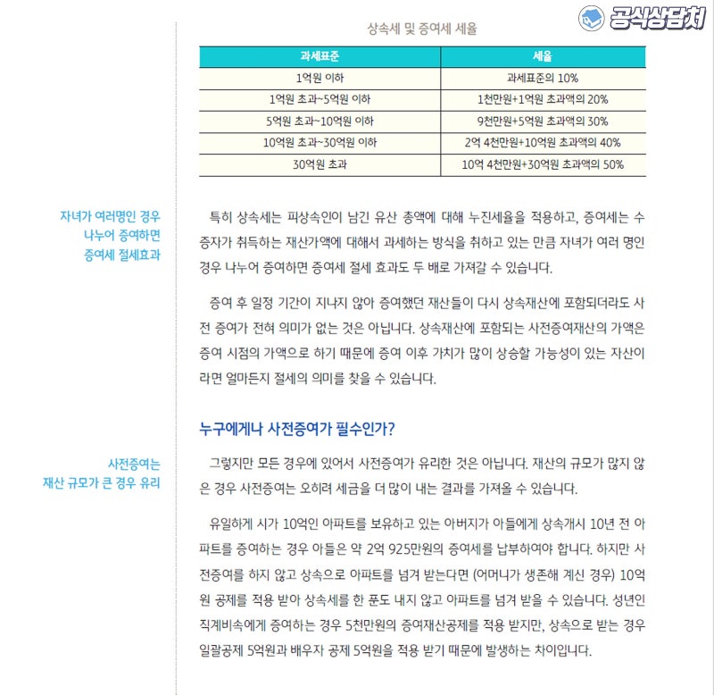 무엇보다 해당 부분은 10년간 누적액을 계산하고 있기 때문에 증여일 전 10년 이내 동일인으로부터 한도를 넘은 재산 이전이 있었다면 초과된 부분에 세금이 과세된다는 점도 잊지 마시기 바랍니다. 상속세 증여세는 명확히 개념이 다르고 면제 한도가 다르지만 세율은 똑같이 적용된다는 점을 알아두면 좋을 것 같습니다.